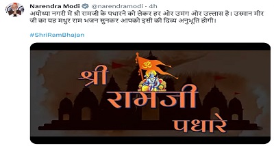 प्रधानमंत्री नरेन्द्र मोदी ने आज सोशल मीडिया पर भजन- श्री राम जी पधारे साझा किया। इस भजन को उस्मान मीर ने गाया है, तथा संगीत रचना ओम दवे और गौरंग…
