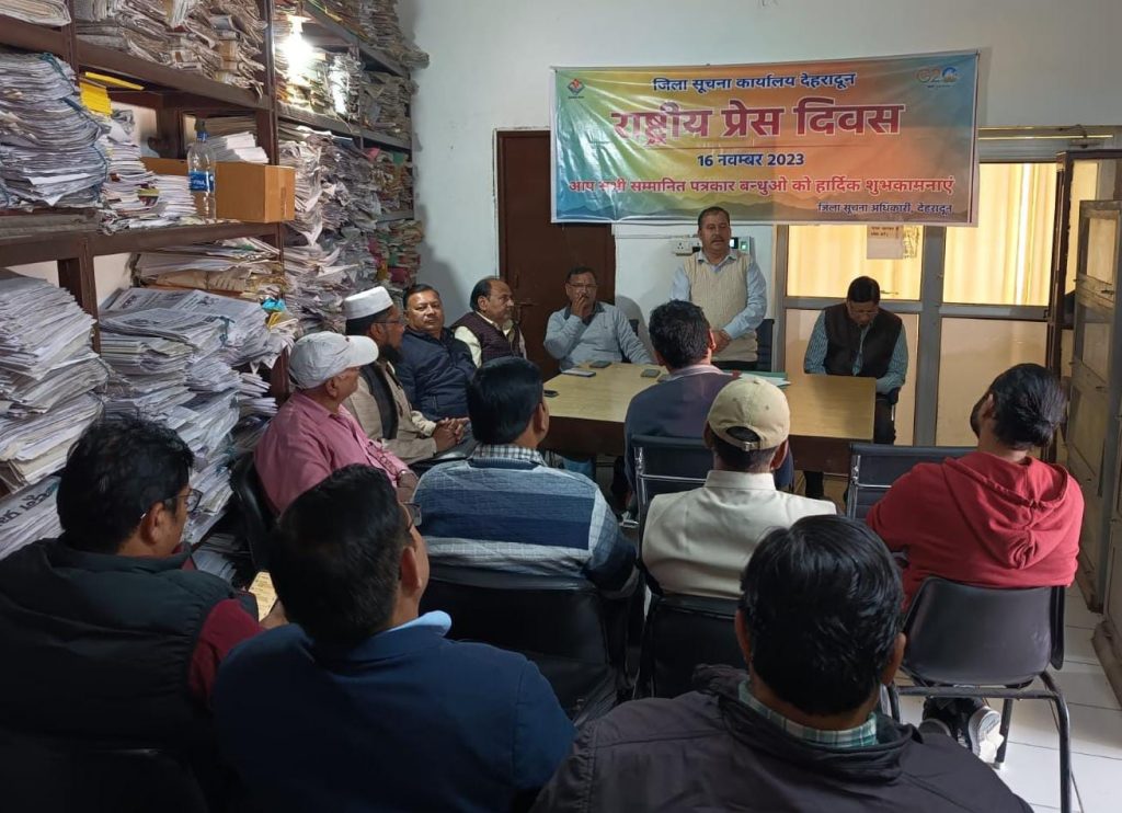 देहरादून दिनांक 16 नवंबर 2023,( जि. सू . का.)  भारतीय प्रेस परिषद नई दिल्ली के निर्देशों के क्रम में  ‘‘राष्ट्रीय प्रेस दिवस के अवसर  16 नवम्बर 2023 को ‘‘ कृत्रिम मेधा’’ (आर्टिफिशियल इंटेलिजेंस) के युग में मीडिया’’ विषय पर सहायक निदेशक/ जिला सूचना अधिकारी बद्री चन्द्र नेगी ने गणमान्य सम्मानित पत्रकारों की उपस्थिति में जिला सूचना कार्यालय गोष्ठी का आयोजन किया गया। गोष्ठी में उपस्थित पत्रकारगणों ने क्रमवार अपने-अपने विचार रखे।